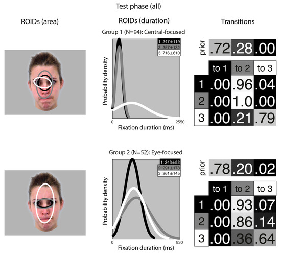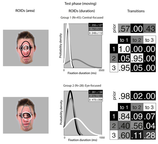 Figure 3 shows the groups obtained when clustering the HMMs from viewing moving faces in the test (recognition) phase. The median number of ROIDs from the individual HMMs was three; thus, the representative cluster HMMs for moving faces included three ROIDs. As in the learning phase, there was significant spatial overlap between several of the ROIDs, but these could be distinguished by the fixation durations within them.
