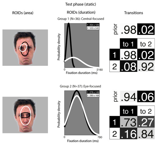 Figure 4 shows the groups obtained when clustering the HMMs from viewing static faces in the test phase. The median number of ROIDs from the individual HMMs was two; thus, the representative cluster HMMs for static faces included two ROIDs. For faces learnt as static images, two clusters were sufficient to summarise the data. Each cluster contained only two ROIDs, both located fairly centrally on the face. In the first group (36 participants), one ROID was characterised by short fixations (M = 254 ms) to an area encompassing the nose (1: black); the other was characterised by longer fixations (M = 533 ms) to the left eye (2: white). Participants in this group typically made repeated short fixations to the nose ROID (1: black), with 95% of the sequences in this group falling into this pattern. While the focus was more limited than in other groups, this group still showed a broad resemblance to the Central-focused patterns in other analyses.