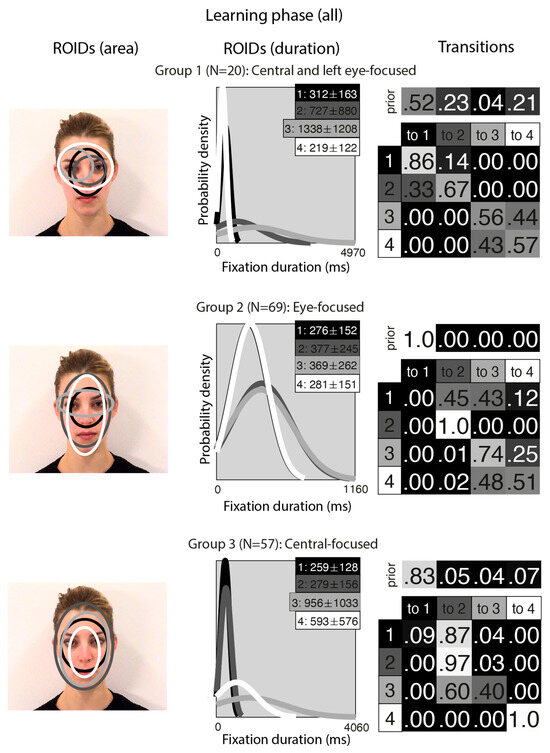 Eye movement patterns for all faces in the learning phase. The ROIDs (area) column shows the centre and two standard deviations around the centre of each ROID. The ROIDs (duration) column shows the distribution of fixation durations (in ms) within each ROID; the boxes at the top right of each duration distribution figure display the mean and standard deviation of the fixations in each ROID (M ± SD). For groups 1 and 2, ROIDs 1 and 4 have very similar duration distributions, and the curves overlap. The Transitions column shows the prior probability of fixation patterns beginning in each ROID (top row) and the probability of transitions between ROIDs (bottom matrix). The colour of the ROID spatial and temporal distributions corresponds to the colour of the background of the boxes showing M ± SD and in the transition table. Black: ROID 1; Dark grey: ROID 2; Light grey: ROID 3; White: ROID 4.