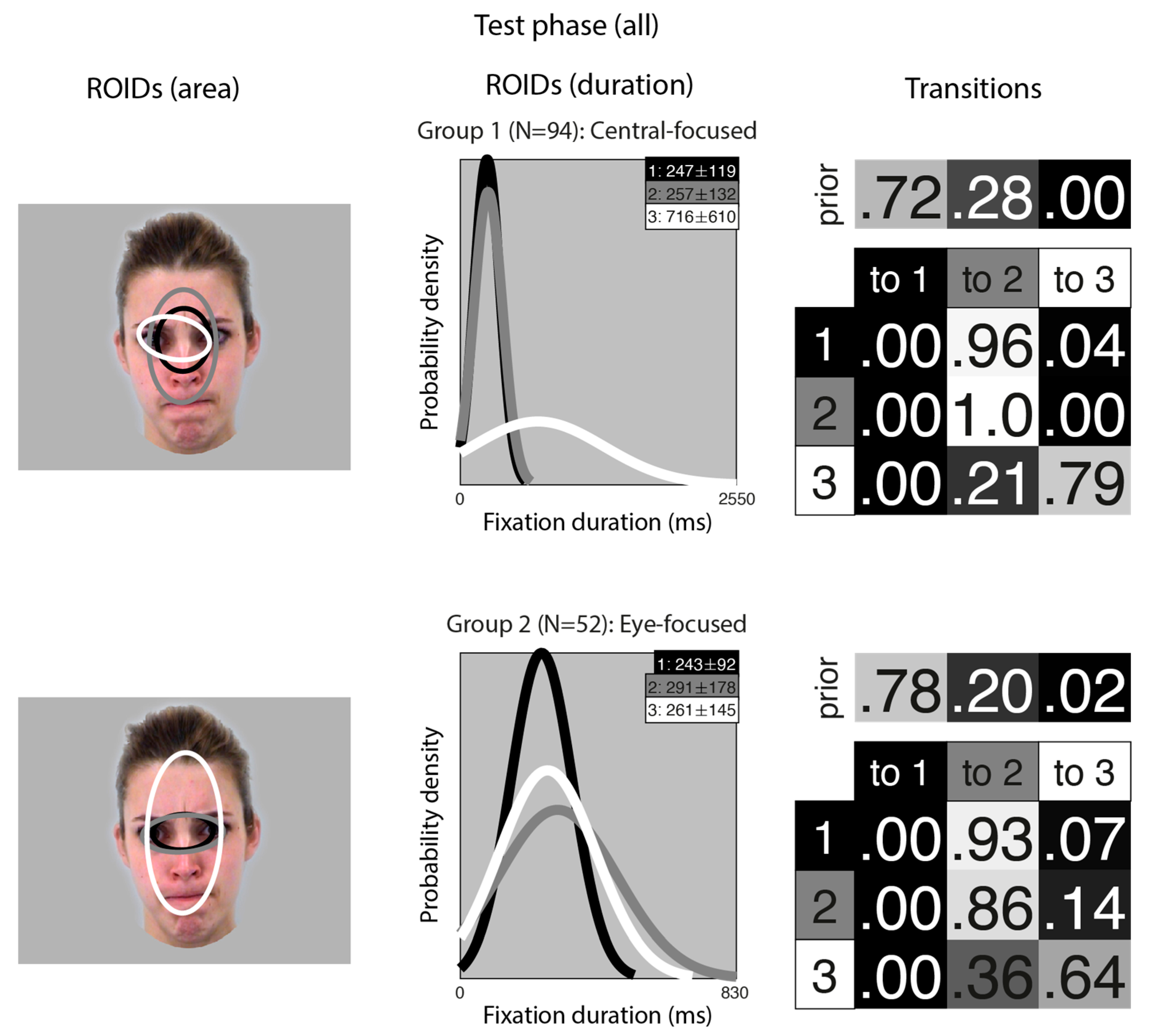 Figure 6. Eye movement patterns for all learnt faces in the test phase. The ROIDs (area) column shows the centre and two standard deviations around the centre of each ROID. The ROIDs (duration) column shows the distribution of fixation durations (in ms) within each ROID; the boxes at the top right of each duration distribution figure display the mean and standard deviation of the fixations in each ROID (M ± SD). The Transitions column shows the prior probability of fixation patterns beginning in each ROID (top row) and the probability of transitions between ROIDs (bottom matrix). The colour of the ROID spatial and temporal distributions corresponds to the colour of the background of the boxes showing M ± SD and in the transition table. Black: ROID 1; Light grey: ROID 2; White: ROID 3.