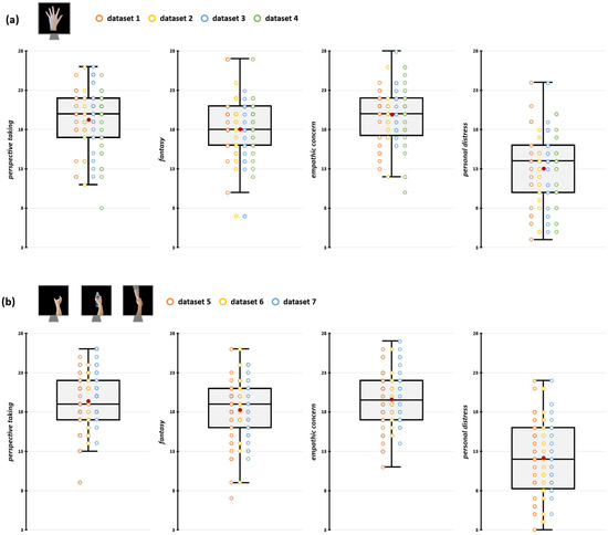 Participants’ IRI scores for datasets depicting index finger abduction (a) and grasping movements (b). In the box-and-whiskers plots, red dots indicate the means of the distributions. The center line denotes their median values. Colored dots show individual participants’ scores according to the specific dataset from which data were collected. The box contains the 25th to 75th percentiles of the dataset. Whiskers extend to the largest observation falling within the 1.5× inter-quartile range from the first/third quartile.