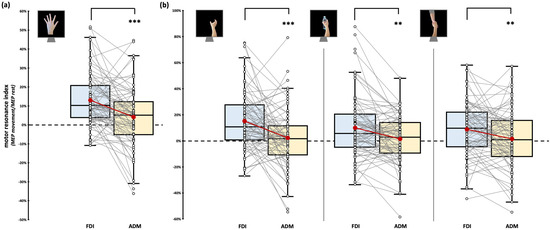 Motor resonance index for FDI (blue boxplot) and ADM (yellow boxplot) muscles. (a) Motor resonance index values recorded during the observation of intransitive index finger abduction movements. (b) Motor resonance index values recorded during the observation of intransitive, object-related, and social-related grasping movements. In the box-and-whiskers plots, red dots indicate the means of the distributions. The center line denotes their median values. White dots show individual participants’ scores. The box contains the 25th to 75th percentiles of the dataset. Whiskers extend to the largest observation falling within the 1.5× inter-quartile range from the first/third quartile. Significant p values of post hoc comparisons are reported (** = p < 0.01; *** = p < 0.001).