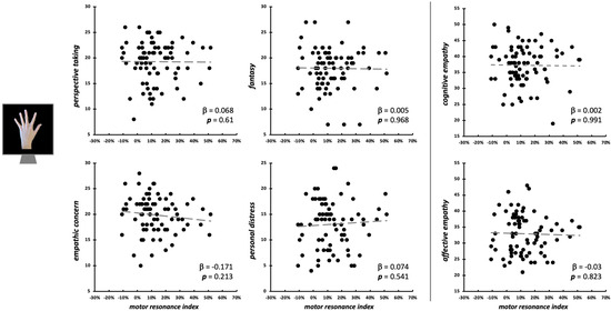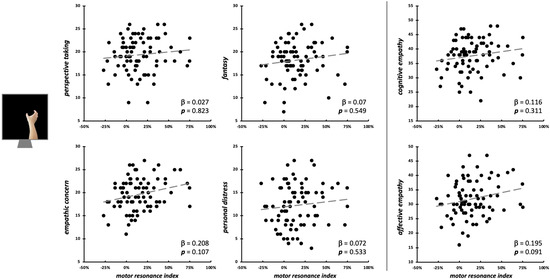 Again, it could be argued that, during the observation of intransitive index-finger abduction, motor resonance was measured in the non-dominant motor cortex (i.e., right M1), whereas, during grasping observation, it was assessed in the dominant motor cortex (i.e., left M1). This methodological difference might represent a potential confound. However, it is worth noting that, at least when observing unilateral hand movements presented from an egocentric perspective, as in our datasets, previous studies have consistently reported that motor resonance exhibits a pattern of hemispheric lateralization, with its detection in the target motor system being strongest during the observation of movements performed by the contralateral hand [59,103,104]. According to this hemispheric mechanism of the motor resonance, CSE was assessed in all our tasks by stimulating the M1 contralateral to the hand that performed the observed movement. Hence, considering that, in both action observation tasks, we stimulated the optimal hemisphere for the features of the visual stimuli depicted, the absence of significant relationships between motor resonance and empathic dimensions during intransitive finger abduction conditions is not due to the stimulation of a different hemisphere with respect to grasping conditions. Nevertheless, to date, less is known about the possible hemispheric specificity of motor resonance–empathy relations, and future studies could also deepen this aspect.