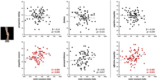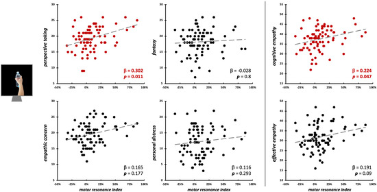 Scatterplot between (FDI) motor resonance index during social-directed grasping observation and IRI scores (left panels: four subscales—PT, FS, EC, PD; right panels: cognitive and affective empathy aggregated scales). Standardized multiple regression coefficients and p-values are reported in the lower corner of the scatterplot. Gray lines indicate linear regression lines. In red: significant relations.