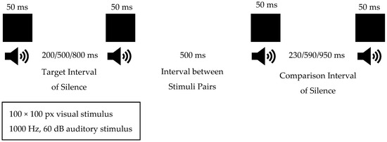 In our study, sensory stimuli that determine interval durations were applied using an assessment method in which both auditory and visual modalities were presented synchronously to isolate the effect of the sensory modality on time perception [11]. A computer software was developed for this method and run via a laptop. When the test was initiated via the software, a black square of 100 × 100 pixels appeared on a white background for 50 ms on the laptop screen, and simultaneously, a 50 ms sine wave tone at 1000 Hz and 60 dB was heard during the 50 ms the square was visible. The duration between the target and comparison stimulus pairs was determined to be 500 ms. In our study, the target interval of silence between stimuli was set to 200 ms, 500 ms, and 800 ms. These durations were chosen based on the information from Huang’s 2012 study, which suggested that shorter durations are more related to the internal clock system and cerebellum, while durations of 800 ms and longer increase the load on working memory [29]. The initial comparison interval of silence duration for 200 ms was set to 230 ms, with a step size of 5 ms. The initial comparison interval of silence duration for the 500 ms was set to 590 ms, with a step size of 15 ms. Finally, the initial comparison interval of silence duration for the 800 ms was set to 950 ms, with a step size of 25 ms (Figure 1). The presentation order of the target and comparison stimuli pairs was random to avoid time-order effects. Additionally, at the beginning of the test, 4 trials were conducted to ensure that the child fully understood the test. In the trials, the target interval of silence duration was 500 ms, and the comparison interval of silence duration was 1000 ms.