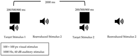 In our study, for the duration reproduction task, the child was asked to produce a stimulus with a duration similar to the stimulus presented, similar to the procedures used in the studies by Wittman et al. (2007) and Yanakieva et al. (2019) [30,31]. A keyboard with a synthesizer was used to allow the child to reproduce the sound. The keyboard’s sound setting was adjusted to match the target stimulus, set to a 1000 Hz sine wave at 60 dB. Visual and auditory stimuli of 200 ms, 500 ms, and 800 ms were used, similar to the stimuli in the duration discrimination task. These stimuli were presented in a completely random order; each was presented 10 times for a total of 30 consecutive stimuli. A 2000 ms interval was left between each stimulus to allow enough time for the child to reproduce the presented stimulus (Figure 2). Before the main part of the test began, one trial was conducted for each duration to ensure the test was understood. The absolute differences between the target durations and each duration the child reproduced were calculated and the ratio of these differences to the target duration was calculated. The average of these ratios was recorded.