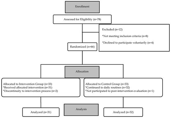 The study was designed as a randomized, controlled, single-blind, 1:1 allocation ratio, two-arm, randomized clinical trial. The required sample size for statistical tests with a power of 80%, Type I error rate of 5%, and effect size of d = 0.34 was determined to be 63 children. Effect size is determined according to the study of Belen in 2019 [25]. Sample size was calculated via “G*Power 3.1” software. Seventy-eight children were found eligible according to the inclusion criteria. Among these, 8 children were excluded due to not meeting the inclusion criteria, and 4 children were excluded for not volunteering to participate, resulting in a total of 12 children being excluded from the study. The study commenced with 66 children who met the inclusion criteria and voluntarily agreed to participate. Each participant was assigned a random study ID that contained no personally identifiable information. An independent researcher outside the study team generated the allocation sequence using a web-based randomization tool (randomizer.org) with 1:1 simple randomization and kept the sequence inaccessible to the investigators involved in screening, enrollment, or assessment. Participant eligibility screening and baseline (pre-intervention) assessments were completed prior to disclosure of group assignment. After each child was enrolled and baseline data were recorded, the independent researcher released the assignment case-by-case to the first author, who then delivered the intervention. Children were allocated to the Intervention Group (IG; n = 33) or Control Group (CG; n = 33).