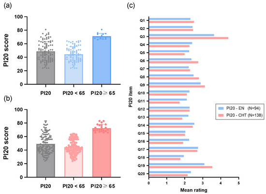 (a) The results of Study 1 showing the mean scores for all participants, those who scored below 65 (PI-20 < 65), and those who scored above 65 (PI-20 ≥ 65). Each dot represents an individual’s score. (b) The results of Study 2 showing the mean scores for all participants, for those who scored below 65 (PI-20 < 65), and those who scored above 65 (PI-20 ≥ 65). Each dot represents an individual’s score. (c) The mean responses across participants for each item in Study 1 (light blue bars) and Study 2 (pink bars).