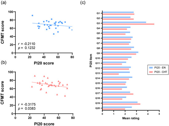 (a) The correlation between the English version of PI-20 scores and the CFMT scores in Group 1. (b) The correlation between the Traditional Chinese version of PI-20 scores and the CFMT scores in Group 2. (c) The mean responses for each item of the PI-20 questionnaire for both versions in Study 3.