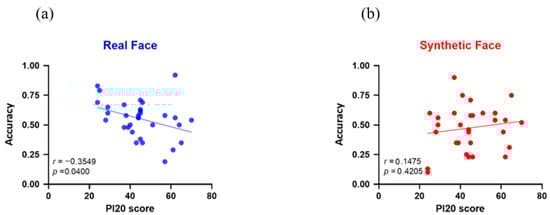 The correlations between the Traditional Chinese version of PI20 score and the accuracy of the Authenticity Judgment task for real faces (a) and synthetic faces (b).