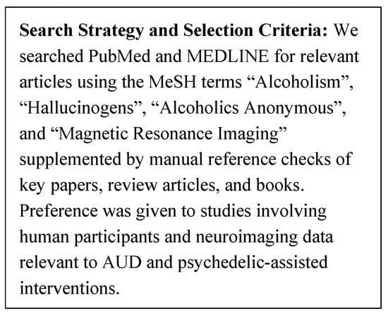 - Pagni, B.A.; Petridis, P.D.; Podrebarac, S.K.; Grinband, J.; Claus, E.D.; Bogenschutz, M.P. Psilocybin-Induced Changes in Neural Reactivity to Alcohol and Emotional Cues in Patients with Alcohol Use Disorder: An fMRI Pilot Study. Sci. Rep. 2024, 14, 3159. [Google Scholar] [CrossRef]
