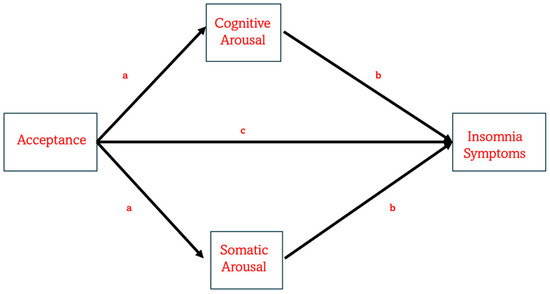 The aim of the present study was to investigate whether, and how, the two components of mindfulness of acceptance and awareness were associated with the severity of insomnia symptoms, either directly or indirectly, through pre-sleep arousal. Specifically, we hypothesized that the acceptance component would be associated with ISI scores both directly and indirectly via other variables, whereas awareness would not significantly contribute to the model [54,64,65,66,67,68,70,77,78,79]. To this end, a large non-clinical sample participated in an online cross-sectional study. Participants completed the Insomnia Severity Index (ISI) [82,87]; the Pre-Sleep Arousal Scale (PSAS), which measures both cognitive and somatic arousal [49,88]; and the Philadelphia Mindfulness Scale (PHLMS), assessing mindfulness components of acceptance and awareness [80,89].