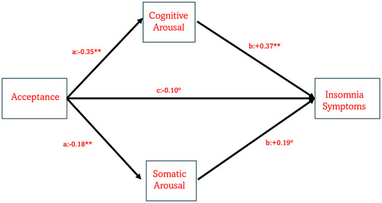 The model illustrates the role of mindfulness acceptance in predicting the severity of insomnia symptoms both directly and indirectly via PSA-C and PSA-S. Note: ° indicates p = 0.005, while ** indicates p = 0.0001.