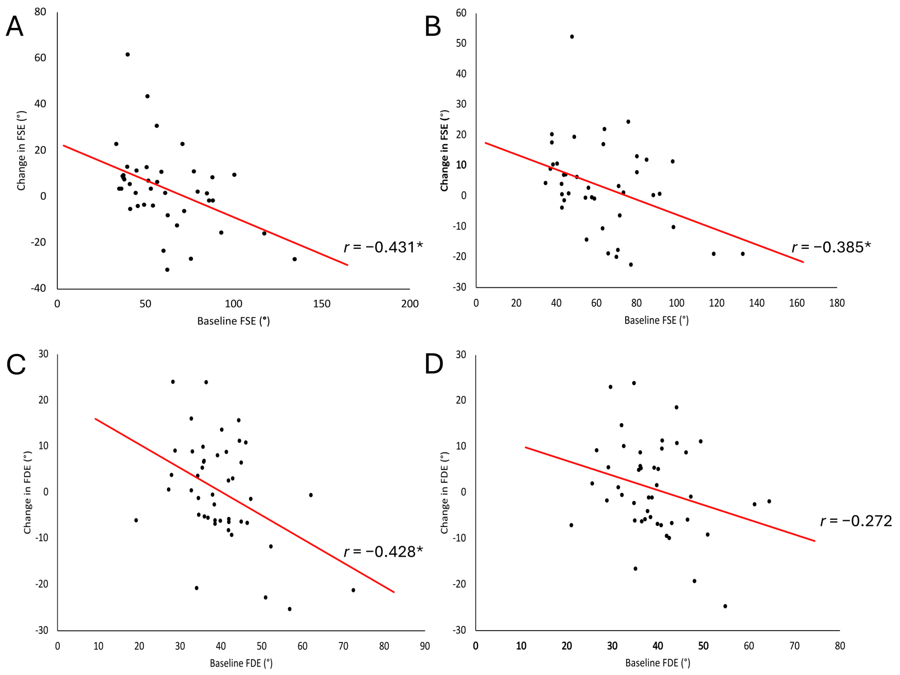 24]. For all analyses, significance was set at α = 0.05. Increases in FSE and FDE are represented as positive values, indicating increased joint angles (i.e., decrease in spasticity), whereas decreases are represented by negative values, indicating decreased joint angles (i.e., increase in spasticity). All data are presented first as FSE