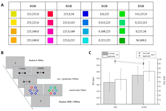 Experiment 1. (A) The colors used in Experiment 1 and their corresponding RGB values. The two columns on the left are warm colors, and the two columns on the right are cool colors. (B) Experimental procedure. Participants were asked to make judgments of the location of the warm color (left and right) under low or high perceptual load conditions. The cue (pure tones at 1500 Hz or 1000 Hz) was presented before the search display, and there is a correlation between the cue and the position of the warm color. (C) Reaction time (bar: RTs/ms) and accuracy (line: ACC/%) under different conditions.