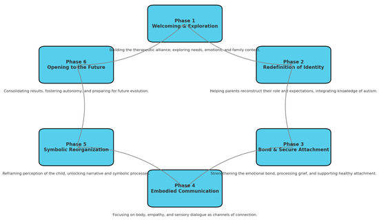As outlined above, the present manuscript represents a step in a complex and gradual research process that has traced the scientific trajectory leading to this work. The theoretical–methodological framework described thus leads to the structuring of an operational parent training protocol, understood not as a prescriptive and rigid sequence of actions, but as a flexible framework capable of adapting to the specific characteristics of the family and of accompanying caregivers in a pathway of awareness, reorganization, and change in relation to their child’s diagnosis. The complexity of the protocol, with its structuring into phases and their associated nodes, allows for an in-depth analysis of the numerous variables that characterize the family processes of individuals with autism spectrum disorder.