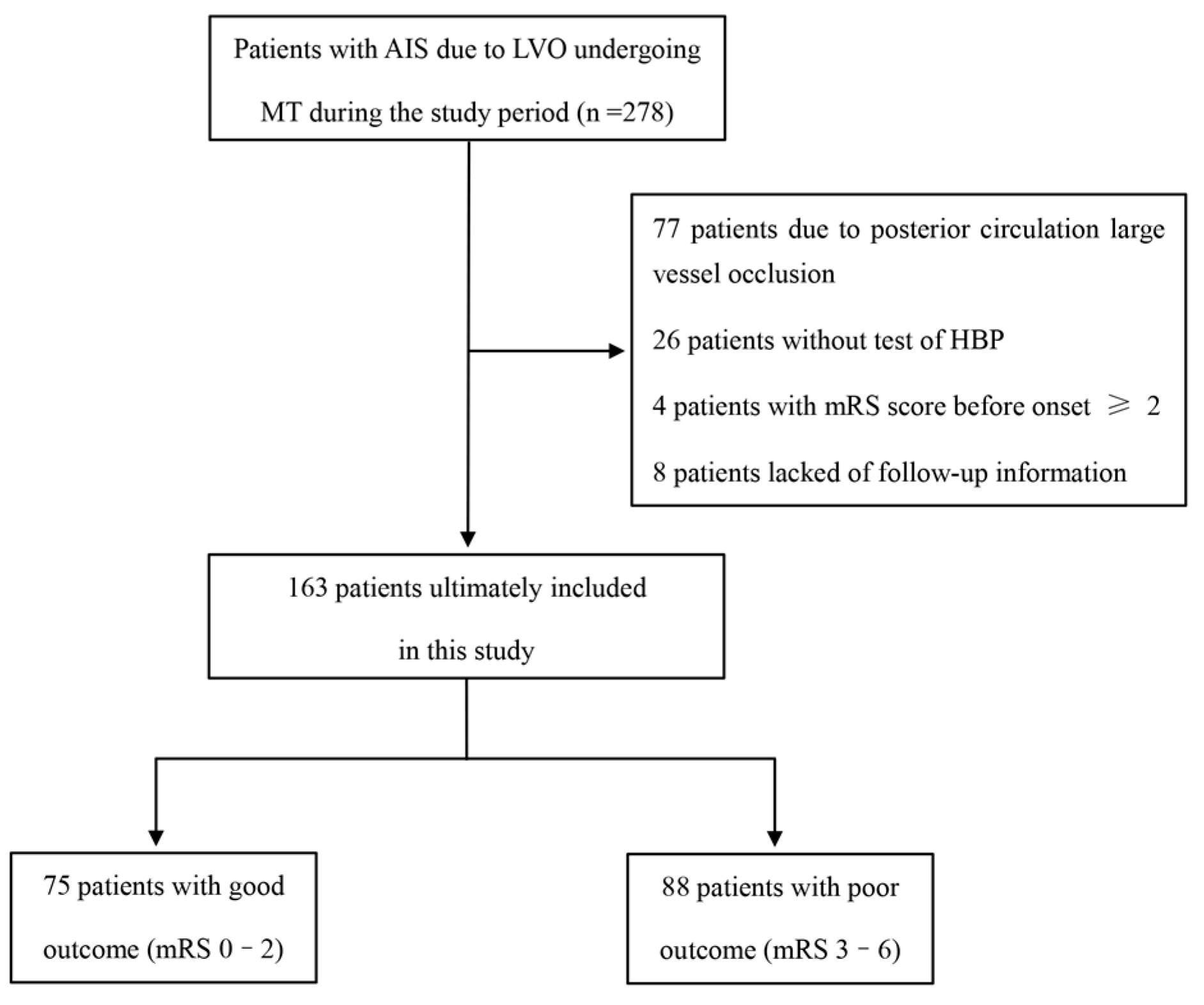 A total of 278 patients with LVO-AIS underwent MT during the study period. After excluding patients with posterior circulation occlusions (n = 77), without HBP testing (n = 26), with pre-stroke mRS ≥ 2 (n = 4), or without follow-up data (n = 8), 163 patients were included in the final analysis. Among these, 88 (54.0%) had poor functional outcomes (mRS 3–6) at 90 days (Figure 1).