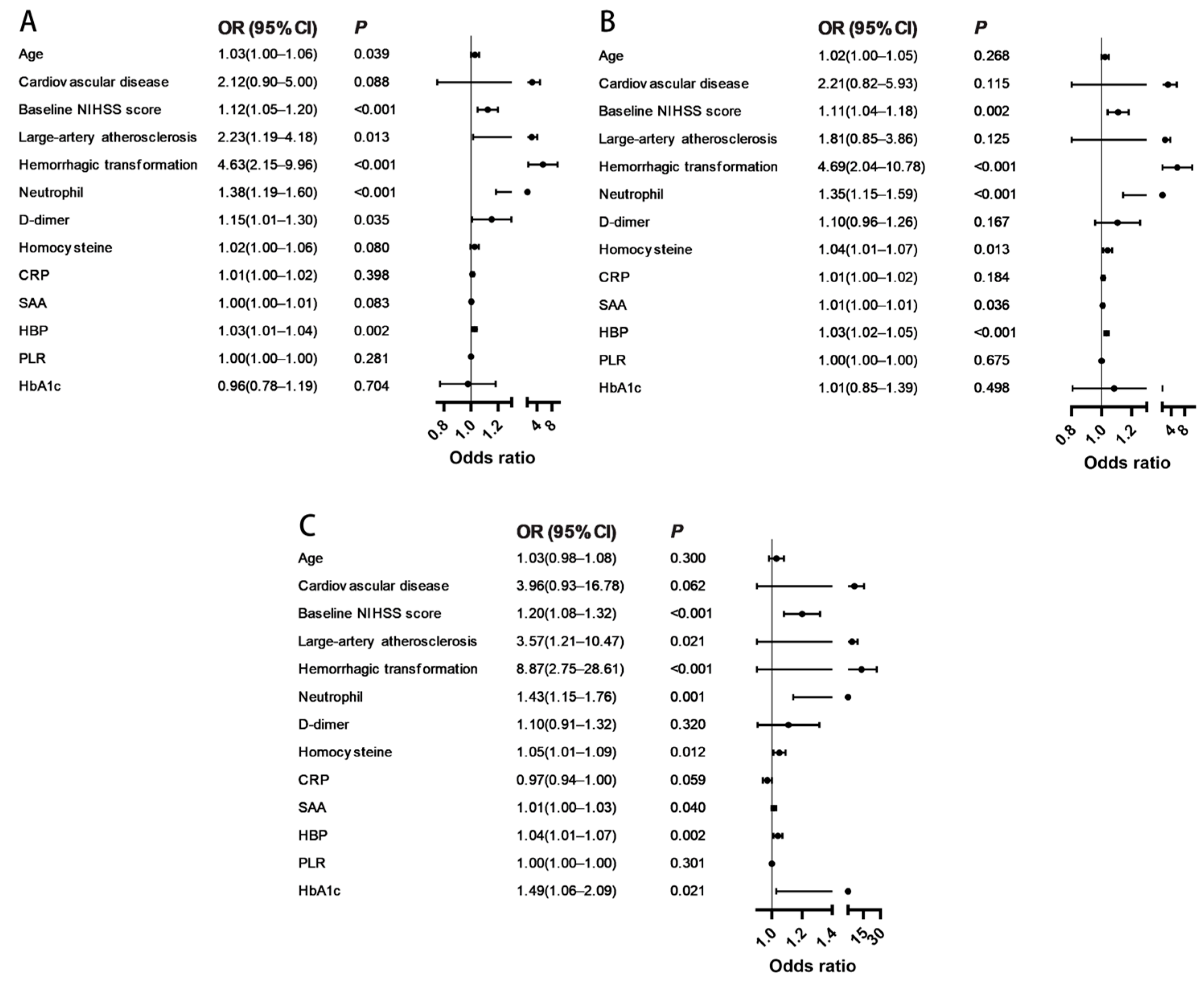 Multivariable logistic regression analysis was conducted to identify independent predictors of poor outcomes. Multicollinearity was assessed using the variance inflation factor (VIF) and was confirmed as absent (all VIFs < 5). Three progressively adjusted models were constructed: Model 1 was unadjusted; Model 2 was adjusted for demographic and clinical factors (age, cardiovascular disease, baseline NIHSS score, large-artery atherosclerosis, and HT); and Model 3 was additionally adjusted for procedural and laboratory parameters, including neutrophil count, D-dimer, HCY, CRP, SAA, HBP, and HbA1c.