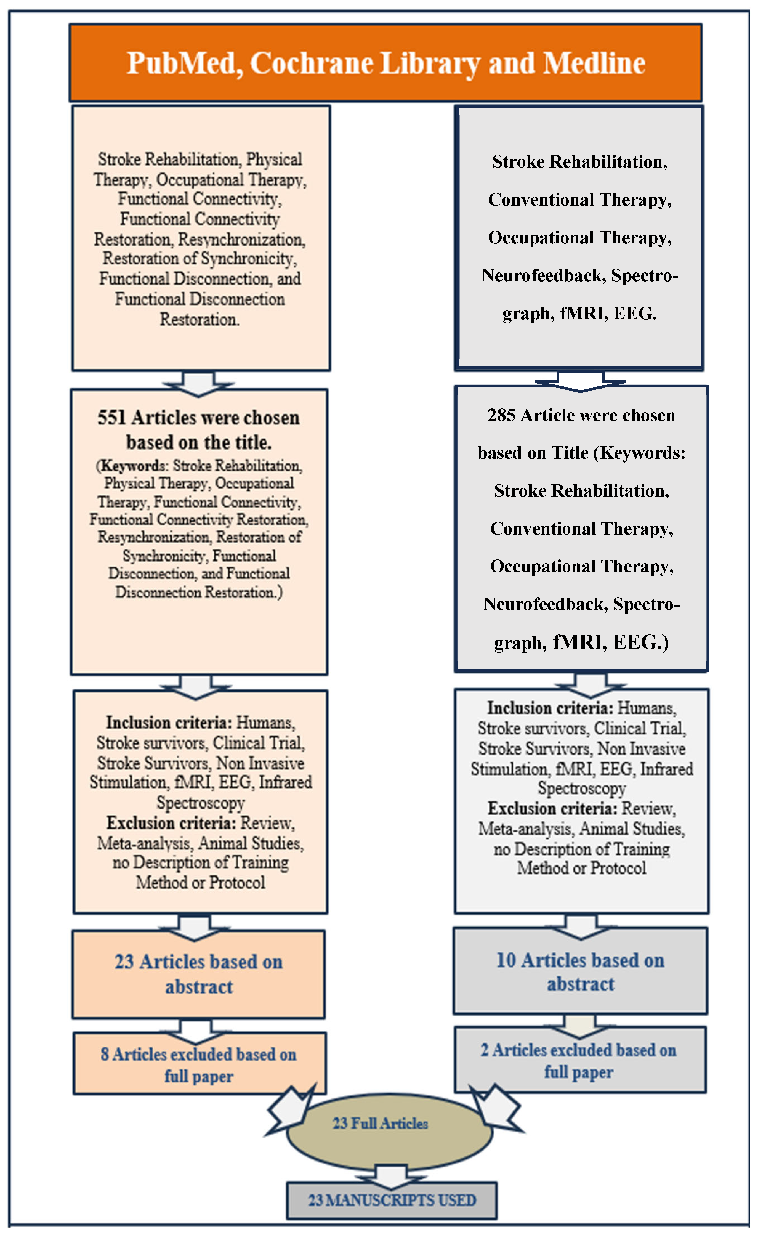 | (“stroke rehabilitation” OR “post-stroke rehabilitation”) AND (“physical therapy” OR “occupational therapy” OR “neuromodulation” OR “neurofeedback” OR “infrared spectrography” OR “fMRI” OR “quantitative EEG”) AND (“functional disconnection” OR “functional connectivity” OR “resynchronization” OR “restoration of synchronicity”) | Date range: 2015–2025 Human studies English language | Humans with a stroke Original clinical or real-world trials Non-invasive stimulation, imaging, or feedback-based interventions Focus on disruptions or restoration of functional connectivity | Reviews, meta-analyses Animal studies No described intervention No mention of connectivity/disconnection |
