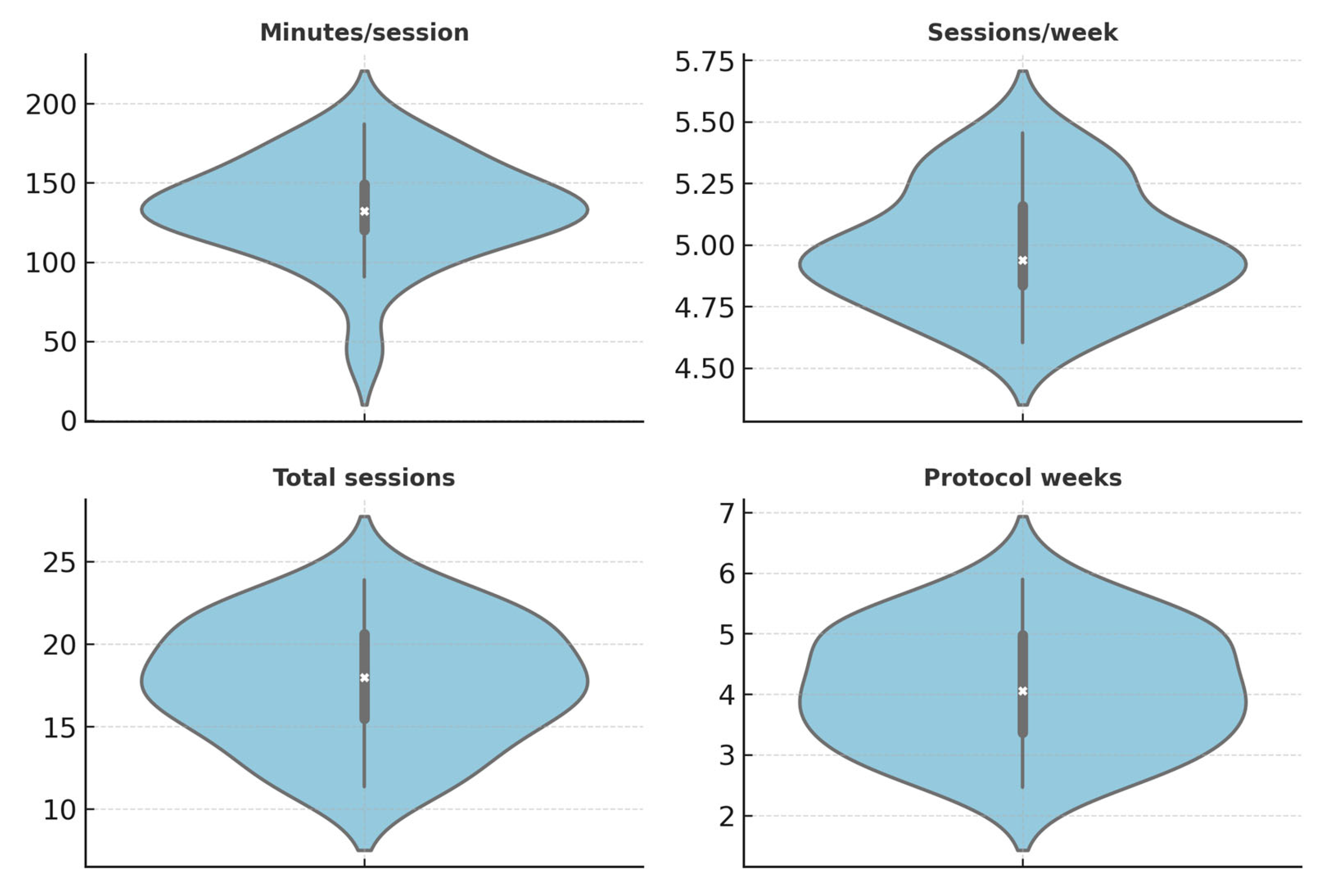 | Sessions per week | 5 [5] | Typical frequency in structured programs (5 sessions per week where reported). |