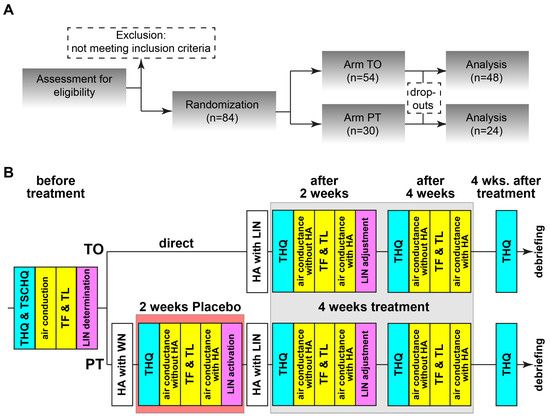 Flow diagram and timeline of the study. (A) All patients were investigated according to this flow chart. TO: noise-treatment-only, PT: placebo-plus-noise-treatment. (B) Details of the two therapeutic arms. THQ: tinnitus health questionnaire, TSCHQ: Tinnitus Sample Case History Questionnaire, TF: tinnitus frequency, TL: tinnitus loudness, LIN: low-intensity noise, HA: hearing aid.