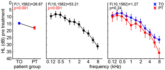 All statistical analyses were performed with Statistica 14 (TIBCO software, Palo Alto, CA, USA). Analyses were performed only on the data of the 72 patients who completed the study; dropouts were not included in the analyses. The initial HL of the patients without HA of both groups was compared using a 2-factorial ANOVA with the factors group and frequency. For detailed pairwise analyses of all datapoints, Tukey post hoc tests with correction for multiple comparisons were used. The TF and TL changes over time within the two patient groups were assessed with nonparametric statistics using Wilcoxon tests or Friedman–ANOVAs and comparisons between TO and PT groups by Mann–Whitney U-tests. As for the tinnitus parameters, nonparametric analyses were used for the assessment of the change in the THQ scores and sub-scores relative to pre-treatment, as these values were discrete as well and Shapiro–Wilk tests rejected normal distribution assumption with p < 0.001. Here, the change in the complete questionnaire score and the change within the different sub-score categories were investigated. Bonferroni corrections of the p-values were used, where needed. The effect size of the nonparametric tests is either given as Kendall coefficient of concordance (Kendall’s W) [35,36] or as η2 value (Pearson’s correlation coefficient squared) [37]. The interpretation of both effect size values has different limits: for Kendal’s W, values below 0.2 indicate a weak effect, between 0.2 and 0.4 a fair effect, between 0.4 and 0.6 a moderate effect, between 0.6 and 0.8 a strong effect, and above 0.8 a very strong effect. For η2, values between 0.02 and 0.13 indicate a weak effect, between 0.13 and 0.26 a moderate effect, and above 0.26 a strong effect. For clarification, we added the interpretation to the effect size values at the respective passage in the Section 3. The complete THQ score has a range of 0 to 84, the different sub-scores have ranges from 0 to 6 (somatic complains), 0 to 8 (sleep disturbances), 0 to 14 (auditory perceptual difficulties), and 0 to 16 (intrusiveness of tinnitus), and the combined cognitive and emotional distress with a range of 0 to 40. Note that we did not include patients with the highest severity index with more than 59 TQH score points. Therefore, the median score (interquartile range) of our patients before the start of the treatment was just 26.5 (16, 35.5); for details, see Section 3.2. The questionnaire outcome was also correlated with the patients’ age, family history of tinnitus appearance, and tinnitus duration, which were extracted from the TSCHQ.