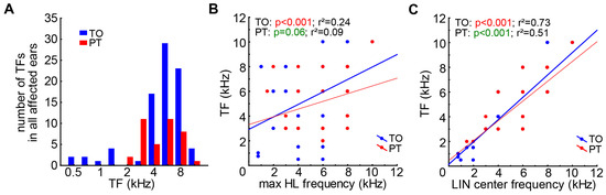 TF distributions and correlations. (A) Distributions of TFs of both patient groups. (B) Linear correlation and regression coefficient of frequency with strongest HL and TF of TO patients, with a trend for such a linear correlation for PT patients. (C) Significant correlations and regression coefficients of the LIN center frequency and the TF in both patient groups.