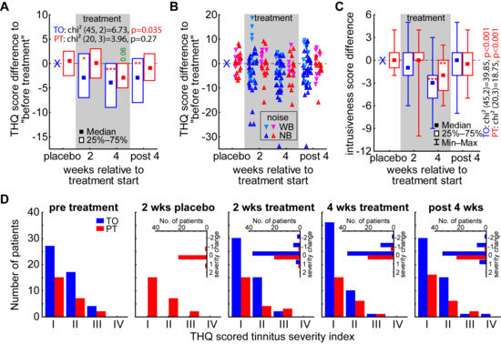 For the investigation of the efficacy of the LINTS treatment, we evaluated the THQ scores in general (global tinnitus severity) and in the five sub-scores over time (cf. Methods and Table 1). In the nonparametric statistical analysis of the global tinnitus severity score change by the Friedman ANOVAs (Figure 4A, Table 1) for both patient groups, we found a significant temporal change only in the TO patient group (p = 0.035), while the PT patients did not show a significant development over time (p = 0.27). When assessing the change in the global tinnitus severity relative to the pre-treatment levels by the Wilcoxon tests (Figure 4A asterisks, Table 2), we find this temporal effect in the TO patient group already starting after 2 weeks of treatment (−3 (−7, 2); p = 0.01), peaking at 4 weeks of treatment (−4 (−9, 0); p < 0.001), but staying significantly lowered up to 4 weeks after the end of the treatment (−3 (−8, 1); p = 0.009). In this case, the NB- and (AM-)optimized LINTS stimulation seems to be superior to the WB noise stimulation, as the most beneficial effects at these three timepoints can be found from that patient group and the more increased global tinnitus severity value changes showed up in the latter subgroup (Figure 4B). This fact becomes evident when Mann–Whitney-U tests are performed between the values of the global tinnitus severity change of the subgroups of TO patients, where at least the tendencies and one significant value for this difference can be found: 2 weeks of treatment U = 254.5, p = 0.04; 4 weeks of treatment U = 240.0, p = 0.10; 4 weeks post treatment U = 236.5, p = 0.05 (cf. also Figure 5). As described above, to investigate the benefit of the LINTS treatment in detail, we analyzed the THQ sub-scores on their temporal development (Table 1) and the effects at each timepoint (Table 2). As an example, for the beneficial effect of the treatment in both patient groups (TO and PT), we show the development of the tinnitus intrusiveness in Figure 4C. Here, both patient groups show comparable temporal effects, with the intrusiveness (maximal score: 16) dropping significantly after four weeks of treatment (TO: −3 (−2, −5); PT −2 (0, −4)). Nevertheless, this change does not seem to be stable, as it vanished after 4 weeks after the treatment. In the TO patient group, we find a significant benefit or trend for such a temporal development in 3 out of the 5 sub-scores (emotional and cognitive distress, tinnitus intrusiveness, and auditory perceptual difficulties; Table 1) and a significant benefit or trend in 11 of the 15 sub-score timepoints (Table 2), with beneficial effects in 4 out of 5 sub-scores in the long-term effect measurement 4 weeks after treatment (all except auditory perceptual difficulties). In the PT group, the 2 weeks of white noise seemed to have a hindering effect on the treatment, as only the intrusiveness showed this temporal pattern and somatic complains showed a trend for this. On the single timepoint level, the beneficial effects are also small, as we find a significant decrease in the score only in 4 out of 20 timepoints. This difference in treatment efficacy can also be seen in the change in the tinnitus severity index in both groups (Figure 4D). While patients in the PT group hardly showed any group shift to a lower index number after 4 weeks of treatment (2/24, 8%), in the TO group, 11 out of 48 (23%) moved their tinnitus severity ranking down at least one index number (with 5 patients reporting no more tinnitus percept during stimulation) and 8 of them stayed there even 4 weeks after the end of treatment.