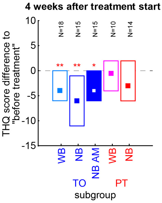 As mentioned above, we wanted to rule out that only one of the subgroups of the TO or PT patient groups showed the described effects (Figure 5). Therefore, the THQ score changes of each subgroup have been tested separately for a change relative to the pre-treatment values (Wilcoxon tests). We found all TO patient subgroups to show a significant decrease of 4 to 6 points (WB: p = 0.009; NB: p = 0.006, NB AM: p = 0.026), with the NB stimulation having the numerically strongest effect. No PT subgroup reached significance in these tests. Neither the TO nor PT subgroups differed significantly from each other (Kruskal–Wallis ANOVA, p > 0.05 in both cases). In other words, the subgroups showed comparable effects and were rightfully taken together as single patient groups.