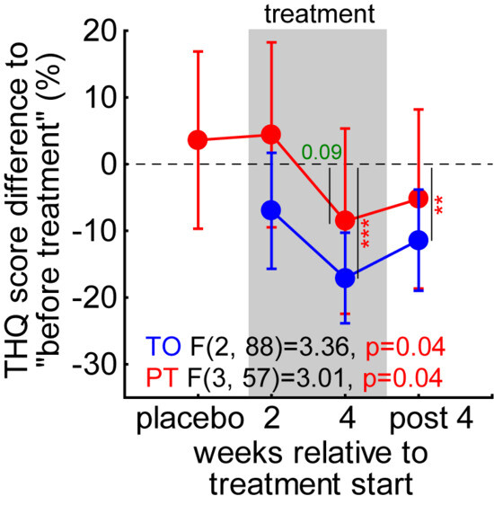 One-factorial ANOVAs of percentual change in THQ score. Two independent significant ANOVAs were calculated for both patient groups. Vertical lines with numbers/asterisks give the timepoints of significant decreases relative to pre-treatment (t-tests). Green value: trend, ** p < 0.01, *** p < 0.001.