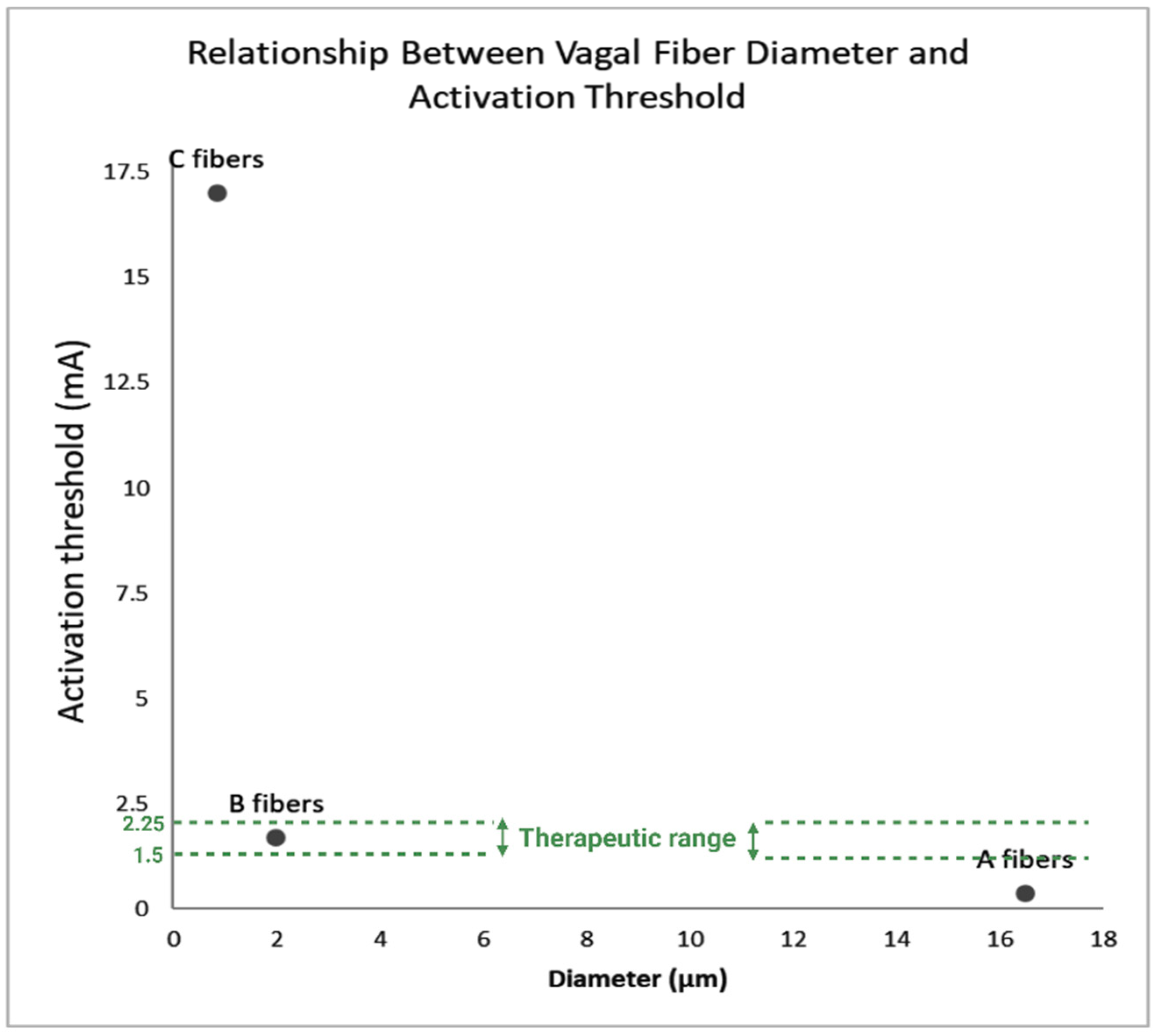 | Fiber-Specificity | VNS primarily activates myelinated A and B fibers, not unmyelinated C fibers, due to lower stimulation thresholds. These fibers mediate therapeutic effects without causing unpleasant sensations. [9,18,19,20,21,22,23,24,25,26,27,28,29,30,31,32] |