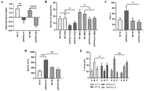 Analysis of behavioral testing in males and females of the APP/Ps1 line at the age of 7.5 months. (A,B) Indicators of preference for a “new” toy in female and male mice in a test for recognizing new objects. (C) Parameters of anxiety behavior in females and males of the APP/Ps1 line and controls in the Open Field test. (D) Mouse activity indicators in the Y-Maze Test. (E) The preference between the “old—C” and “new—B” arm in the Y-Maze Test. * p < 0.05; ** p < 0.01; *** p < 0.0004; **** p < 0.0001.
