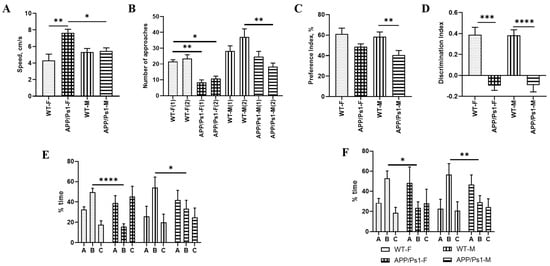 Analysis of behavioral testing in males and females of the APP/Ps1 line at the age of 10 months. (A) Activity indicators in the New Object Recognition test. (B) Indicators of preference for a “new” toy in female and male mice in a test for recognizing new objects. (C) Preference index in the New Object Recognition test, and (D) discrimination index in the New Object Recognition test. (E) The preference between the “old—C ” and “new—B” arm in the Y-Maze Test within 2 min, and (F) The preference between the “old—C ” and “new—B” arm in the Y-Maze Test within 5 min. * p < 0.05; ** p < 0.01; *** p < 0.0004; **** p < 0.0001.