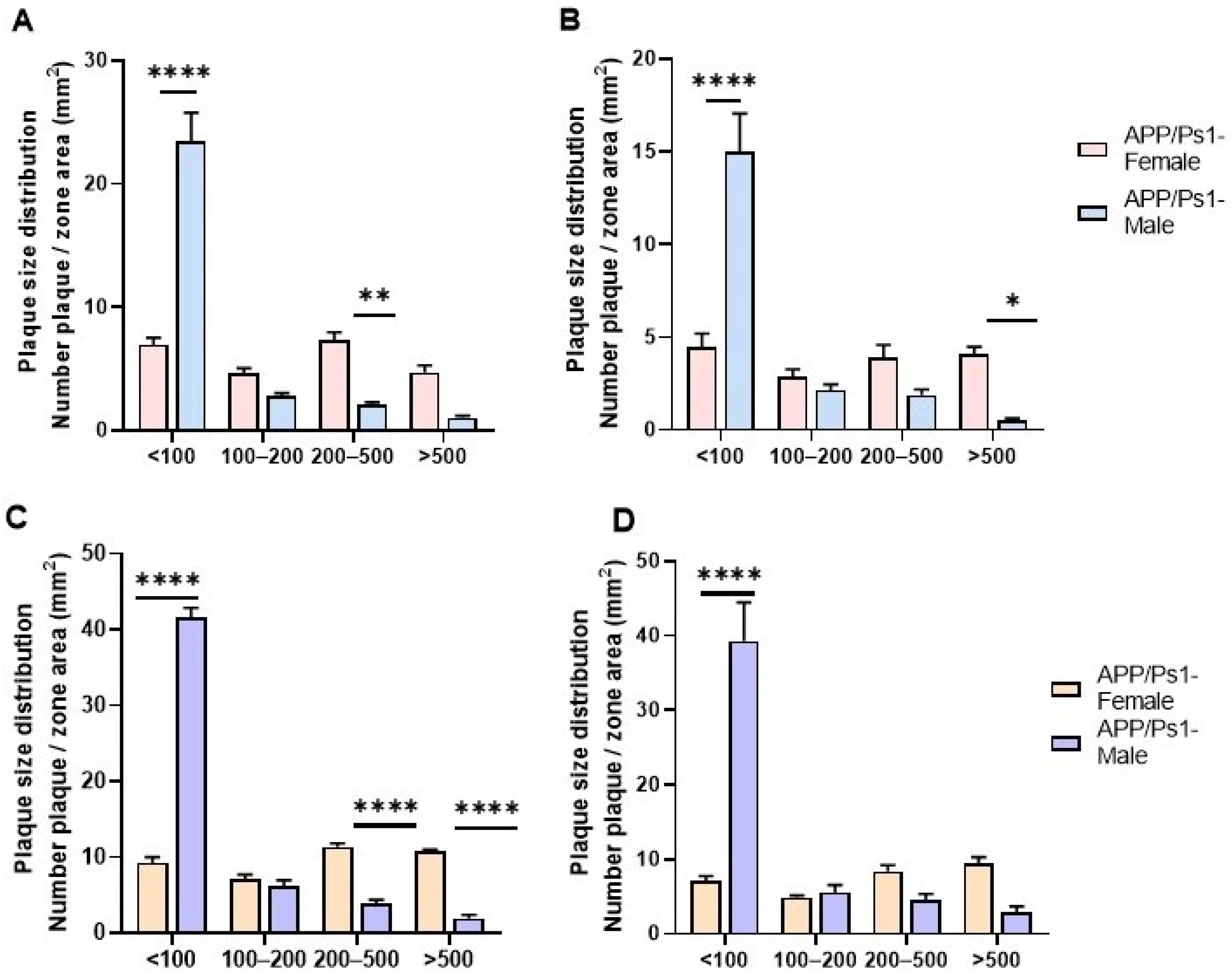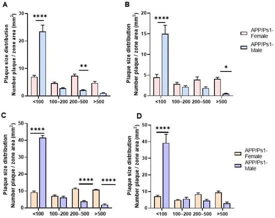 In females, despite a lower number of small plaques, a significantly greater number of mature, large plaques was observed. At 7.5 months, plaques sized 200–500 μm predominated in the cortex (p = 0.0043, Figure 7A), while in the hippocampus, very large plaques >500 μm were predominant (p = 0.0423, Figure 7B). By 10 months, the pattern of predominance of larger plaques in the cortex of females compared to that in males became more pronounced (plaques sized 200–500 μm and >500 μm had p < 0.0001, Sidak’s multiple comparisons test, Figure 7C), whereas in the hippocampus, the difference in the number of large plaques disappeared completely (Figure 7D).