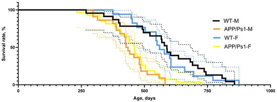 No differences in the survival curve were found between female and male APP/Ps1 mice. The survival rate was statistically significantly different for both males and females when compared to that in control animals (p = 0.0006, p < 0.0001, Gehan-Breslow-Wilcoxon test, Figure 8).