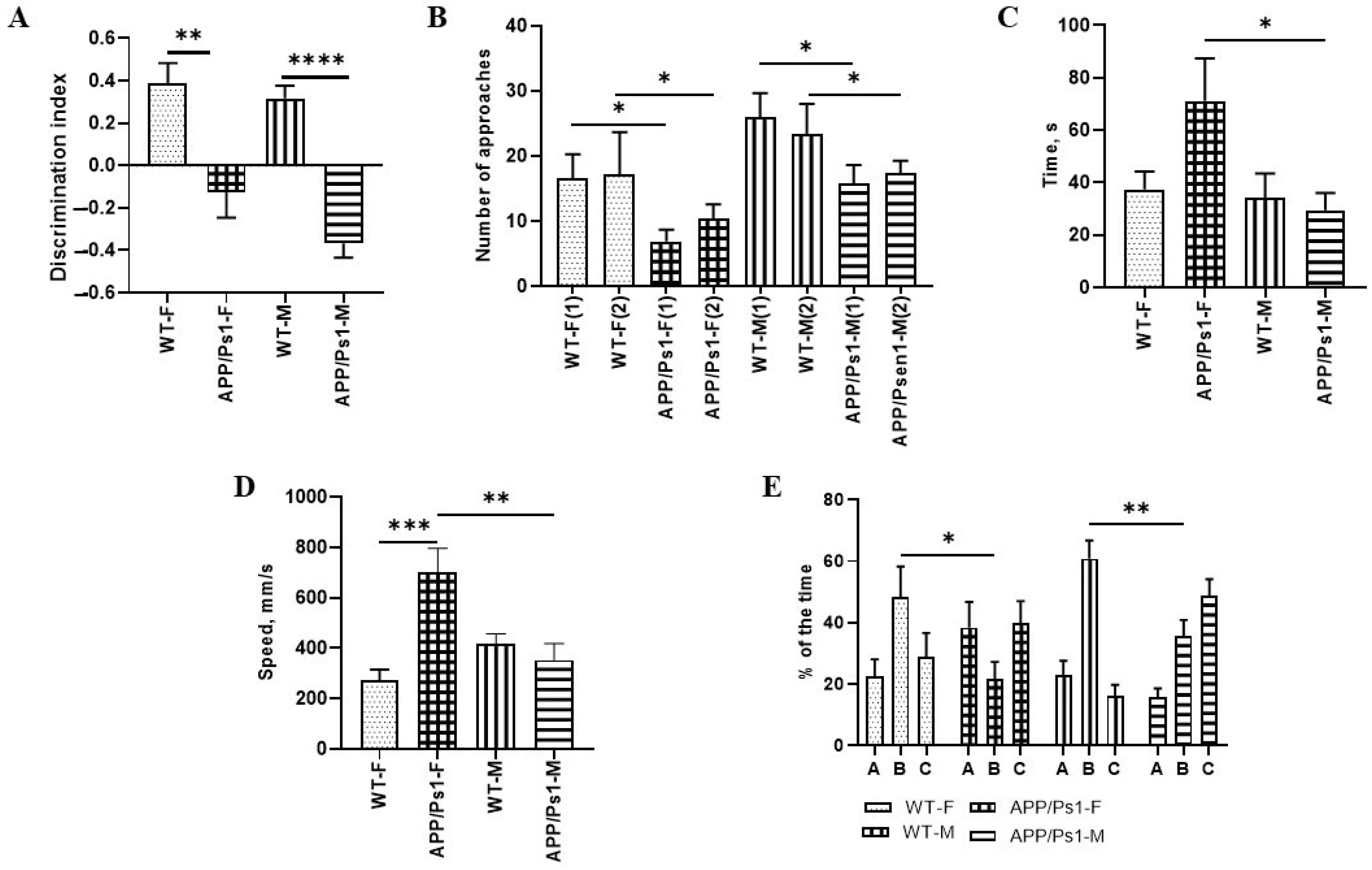 Figure 2. Analysis of behavioral testing in males and females of the APP/Ps1 line at the age of 7.5 months. (A,B) Indicators of preference for a “new” toy in female and male mice in a test for recognizing new objects. (C) Parameters of anxiety behavior in females and males of the APP/Ps1 line and controls in the Open Field test. (D) Mouse activity indicators in the Y-Maze Test. (E) The preference between the “old—C” and “new—B” arm in the Y-Maze Test. * p < 0.05; ** p < 0.01; *** p < 0.0004; **** p < 0.0001.