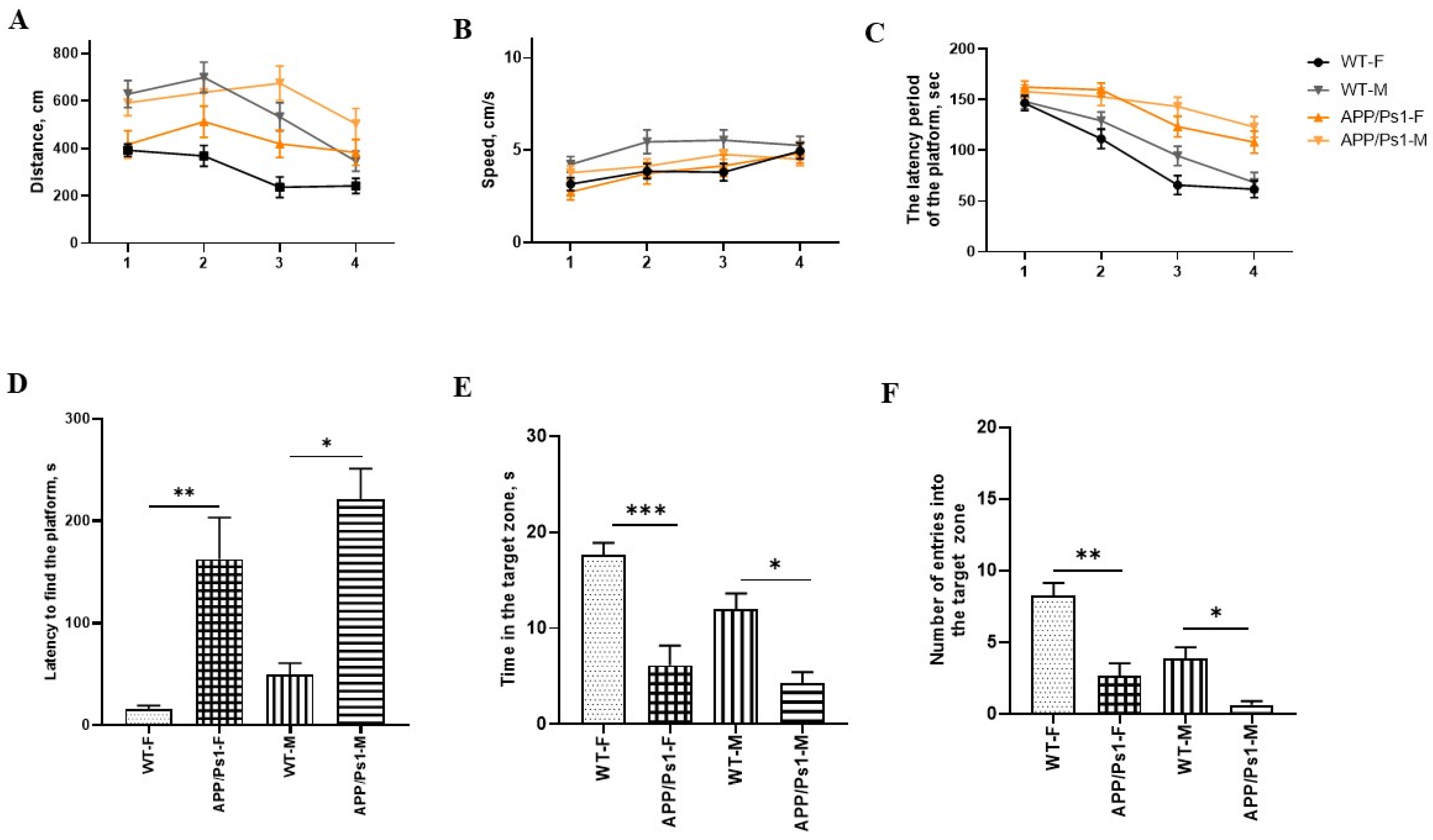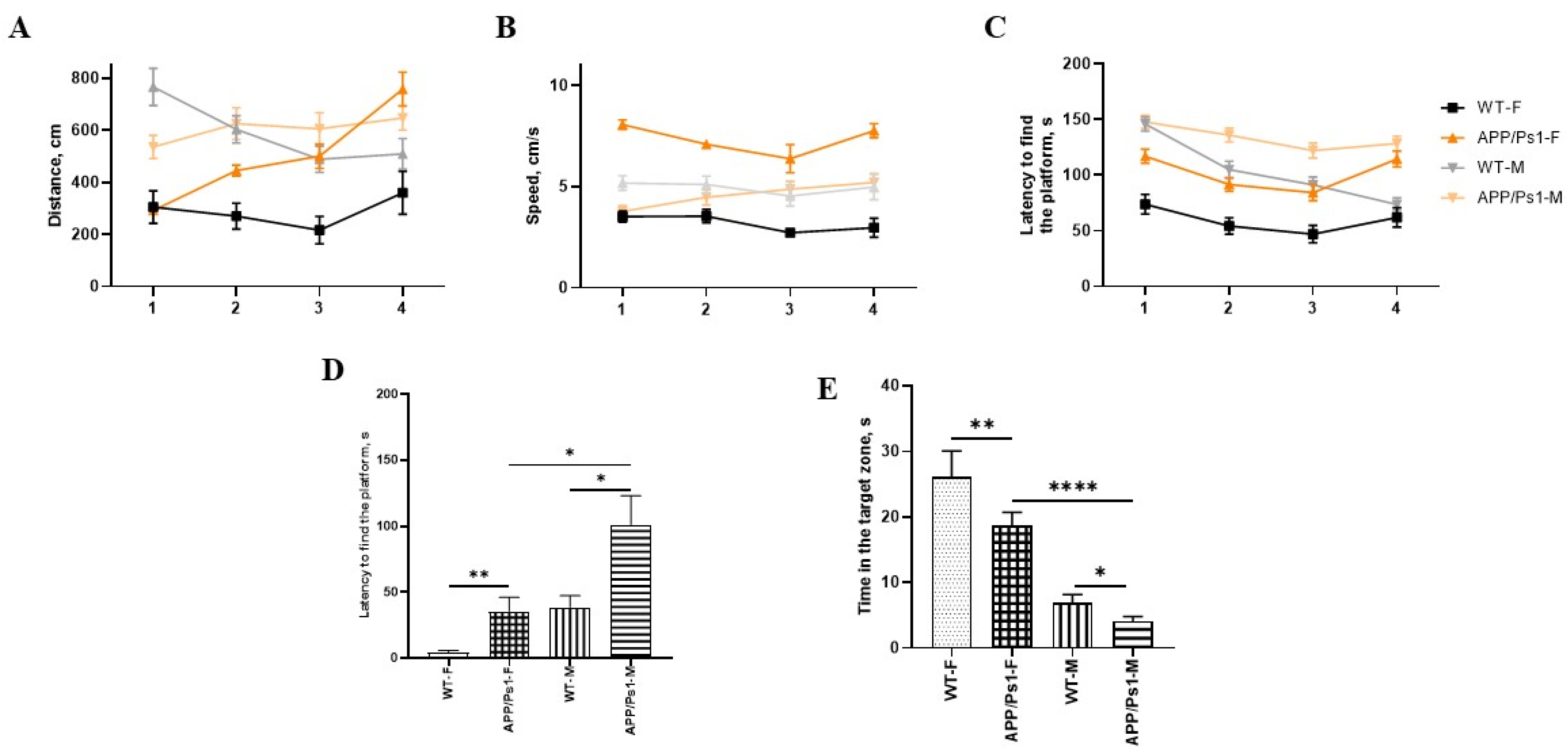 As can be seen from the data, there were no statistical differences in distance and speed between females and males during all 4 days (Figure 3A,B). In male APP/Ps1 mice, the latency to find the platform showed no statistically significant improvement over the training period, suggesting a lack of learning progression.