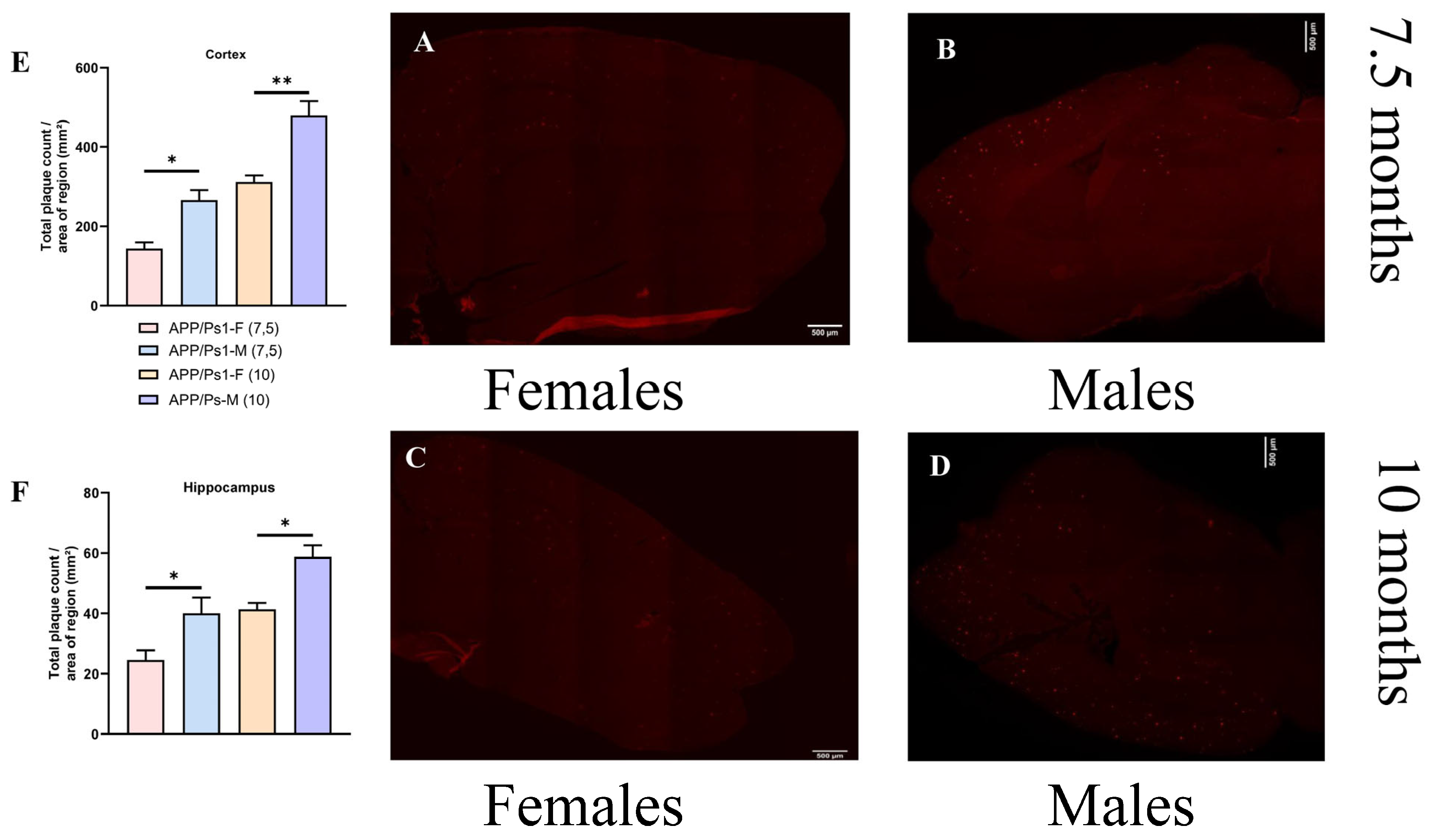 Figure 6. Histological analysis of amyloid deposits. Panoramic shooting in the TRITC fluorescence mode of a mouse brain slice was performed with a 10× lens in the NIS Elements AR version 4.6 application with frame stitching into a single composite image, 10% overlap and automatic post-processing, scale ruler—500 microns. (A) A snapshot of a 7.5-month-old female and (B) a snapshot of a 7.5-month-old male. (C) A snapshot of a 10-month-old female and (D) a snapshot of a 10-month-old male (E). The total number of amyloid accumulations in the cerebral cortex and (F) in hippocampus. * p < 0.05; ** p < 0.01.