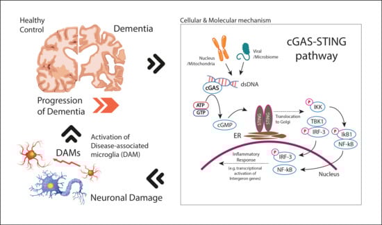 Additionally, the cGAS-STING pathway is increasingly seen as a major player in mediating these inflammatory responses, linking cytosolic DNA sensing to neuroinflammatory cascades [,,,,]. Although no cure exists for AD or other forms of dementia, targeting neuroinflammatory signaling such as modulating microglial activation, inhibiting pro-inflammatory cytokines, or suppressing the cGAS-STING pathway has emerged as a promising therapeutic strategy for their potential to slow disease progression and preserve cognitive function [,]. Accordingly, this review summarizes current understanding of neuroinflammation and highlights emerging evidence for the cGAS-STING pathway as a diagnostic and therapeutic target in dementia.