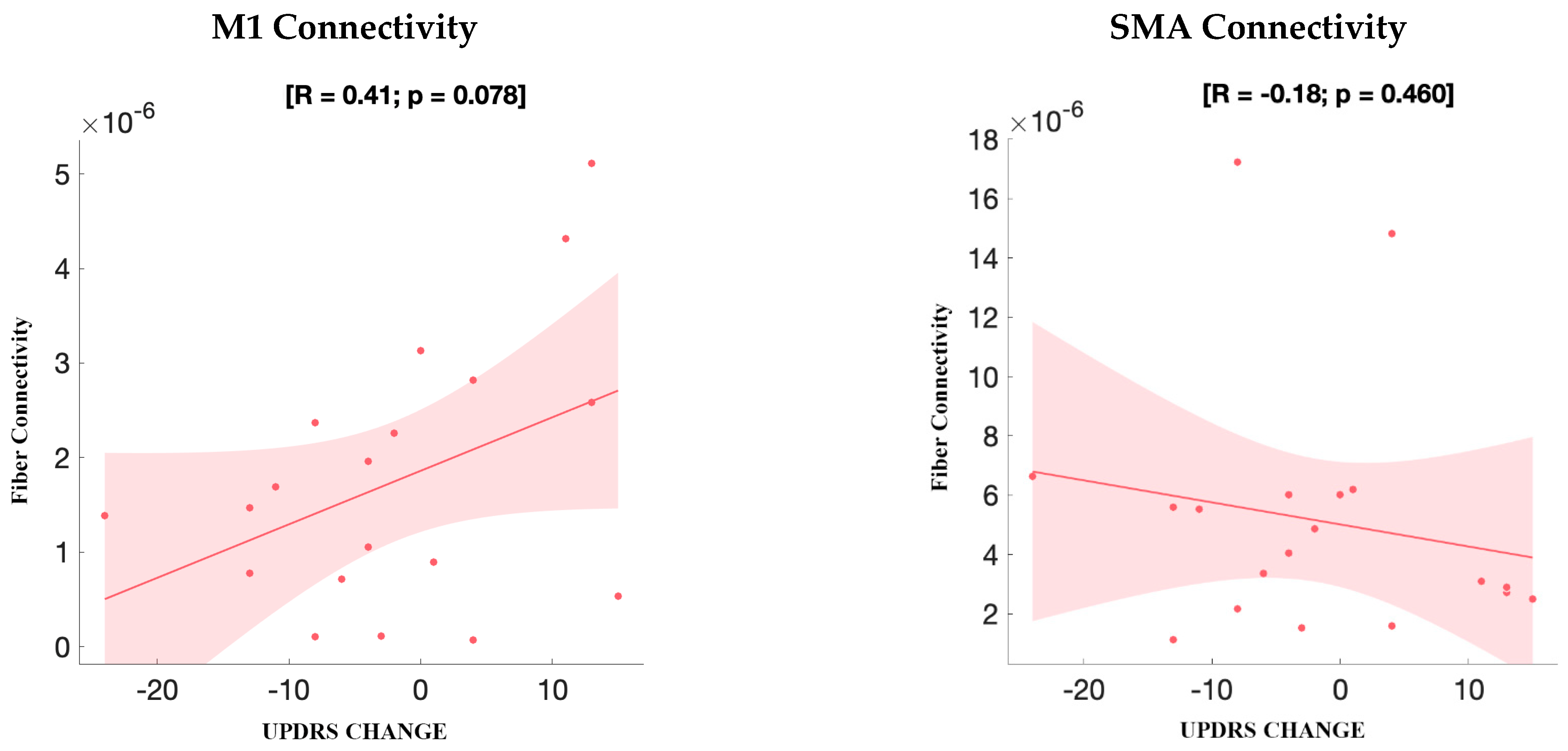 Figure 3. Secondary analysis: correlation between fiber connectivity and UPDRS-III change. Scatterplots show the relationship between motor improvement (ΔUPDRS) and structural fiber connectivity from GPi VTA seeds to motor regions. A positive correlation was observed between ΔUPDRS improvement and M1 connectivity (left; R = 0.41, p = 0.078), although this did not reach statistical significance. No significant correlation was found between SMA connectivity and ΔUPDRS improvement (right; R = −0.18, p = 0.460).
