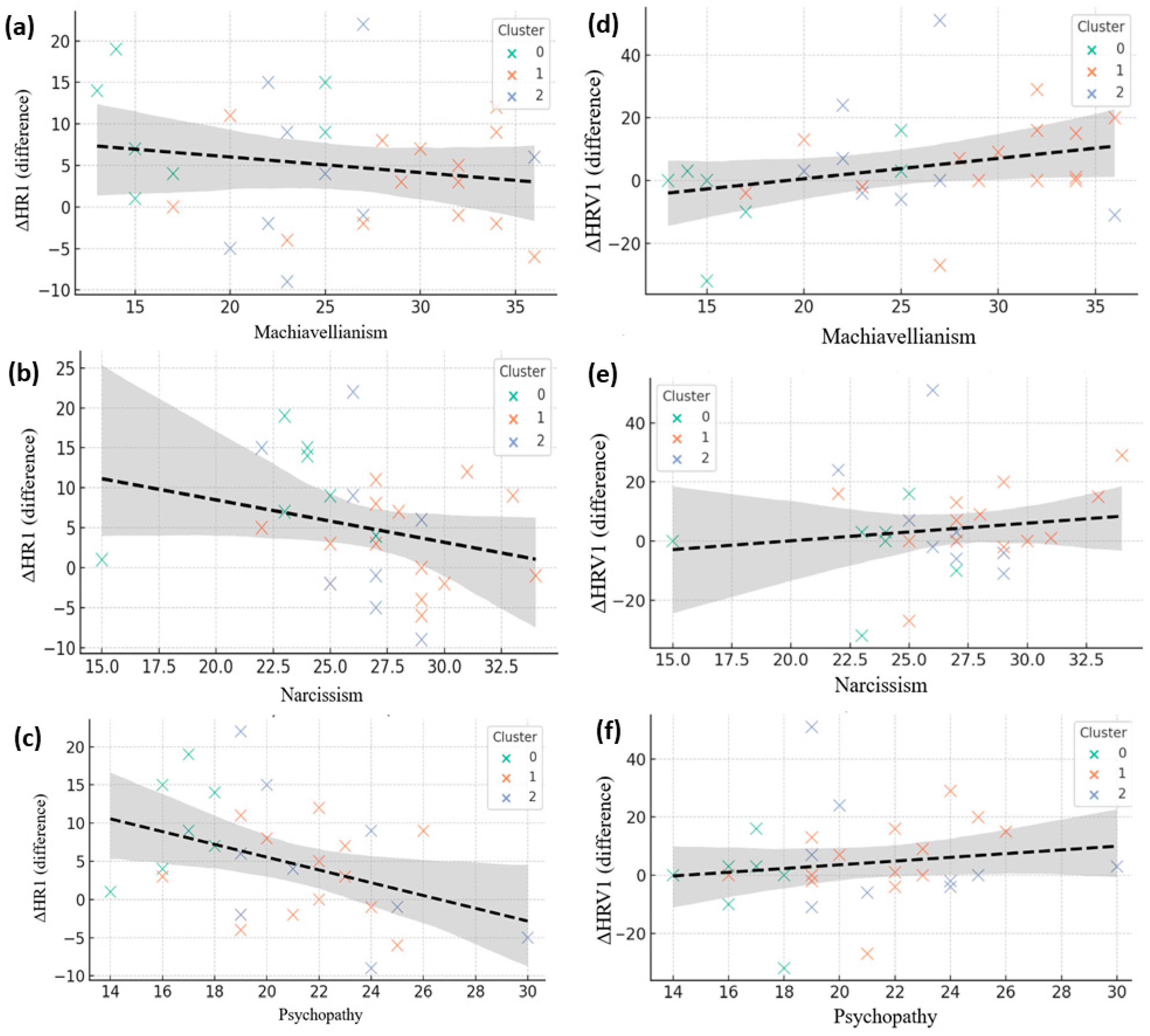 Correlations between Dark Triad traits and autonomic reactivity in neutral conditions. (a–c) Associations between Machiavellianism, Narcissism, and Psychopathy with heart rate change (ΔHR). (d–f) Corresponding associations with heart rate variability change (ΔHRV). Each point represents a participant, color-coded by psychological cluster (green = Cluster 0, orange = Cluster 1, blue = Cluster 2). Dashed lines indicate linear regression fits with shaded 95% confidence intervals.