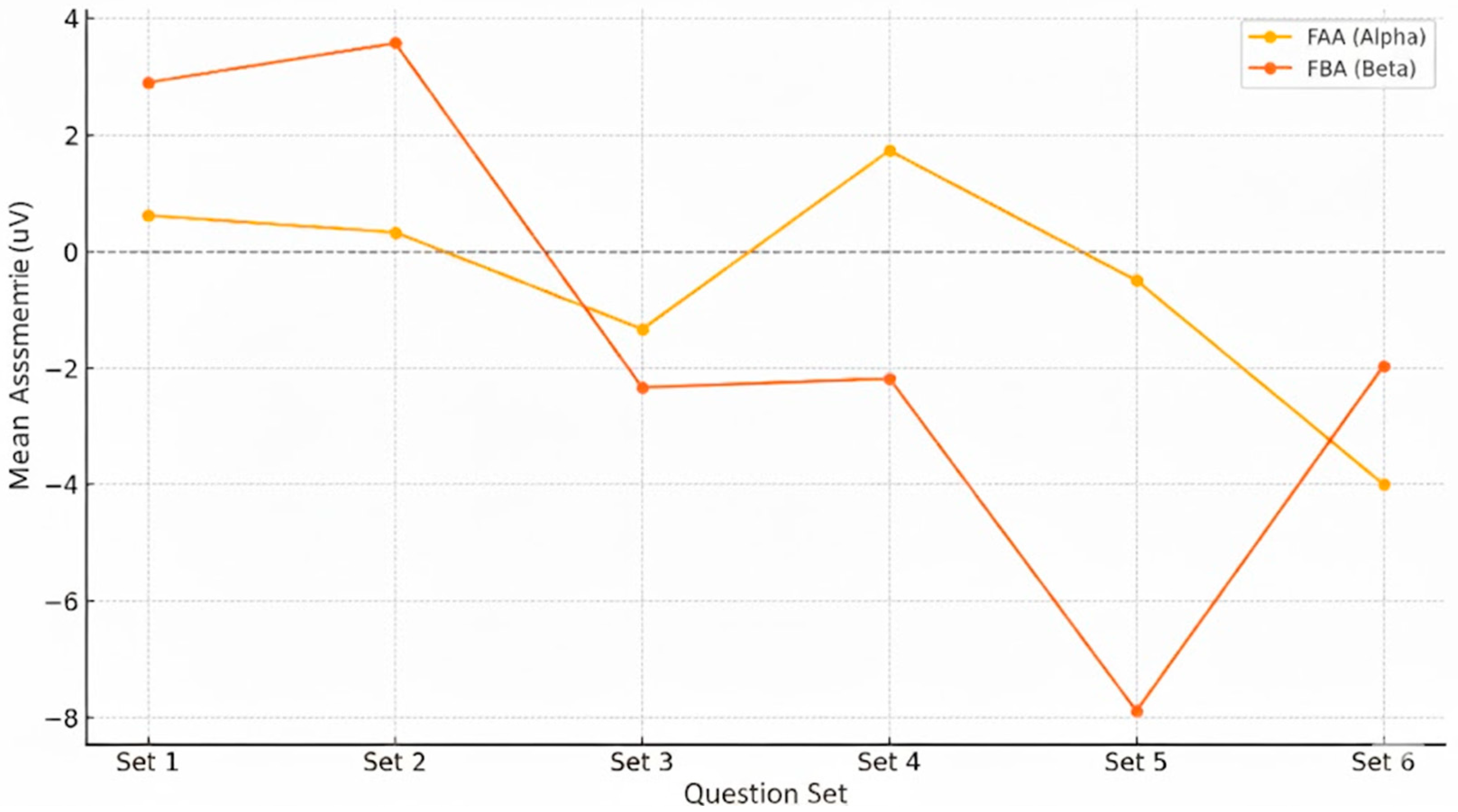Evolution of frontal EEG asymmetry in Alpha (FAA) and Beta (FBA) across the six question sets. Values are mean right–left differences (μV) over frontal sites; positive = left dominance (reduced right activation), negative = right dominance (greater right activation).