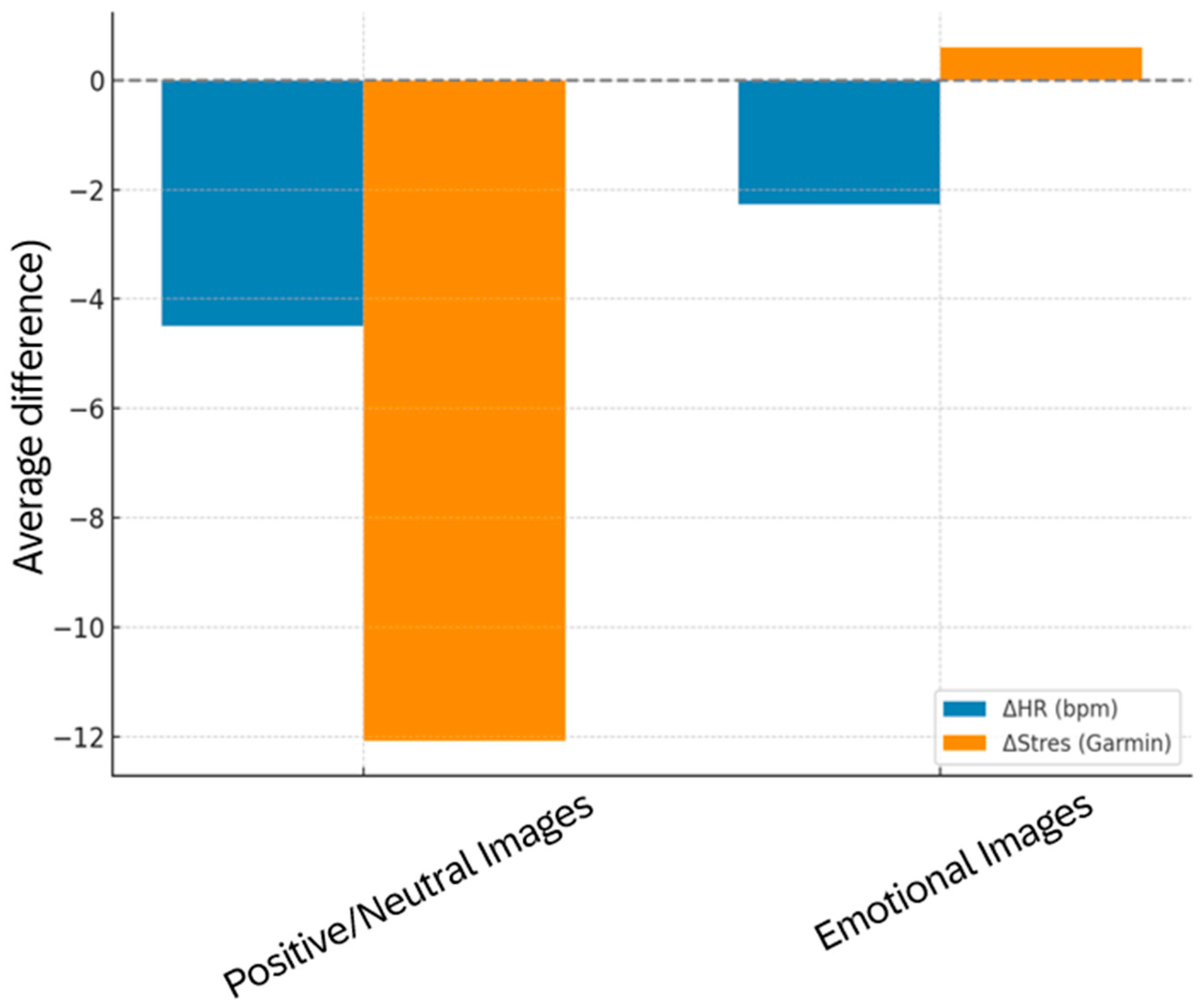 Bar plot of ΔHR (bpm) and ΔStress during exposure to positive/neutral vs. negative images. Negative values indicate reductions from baseline.