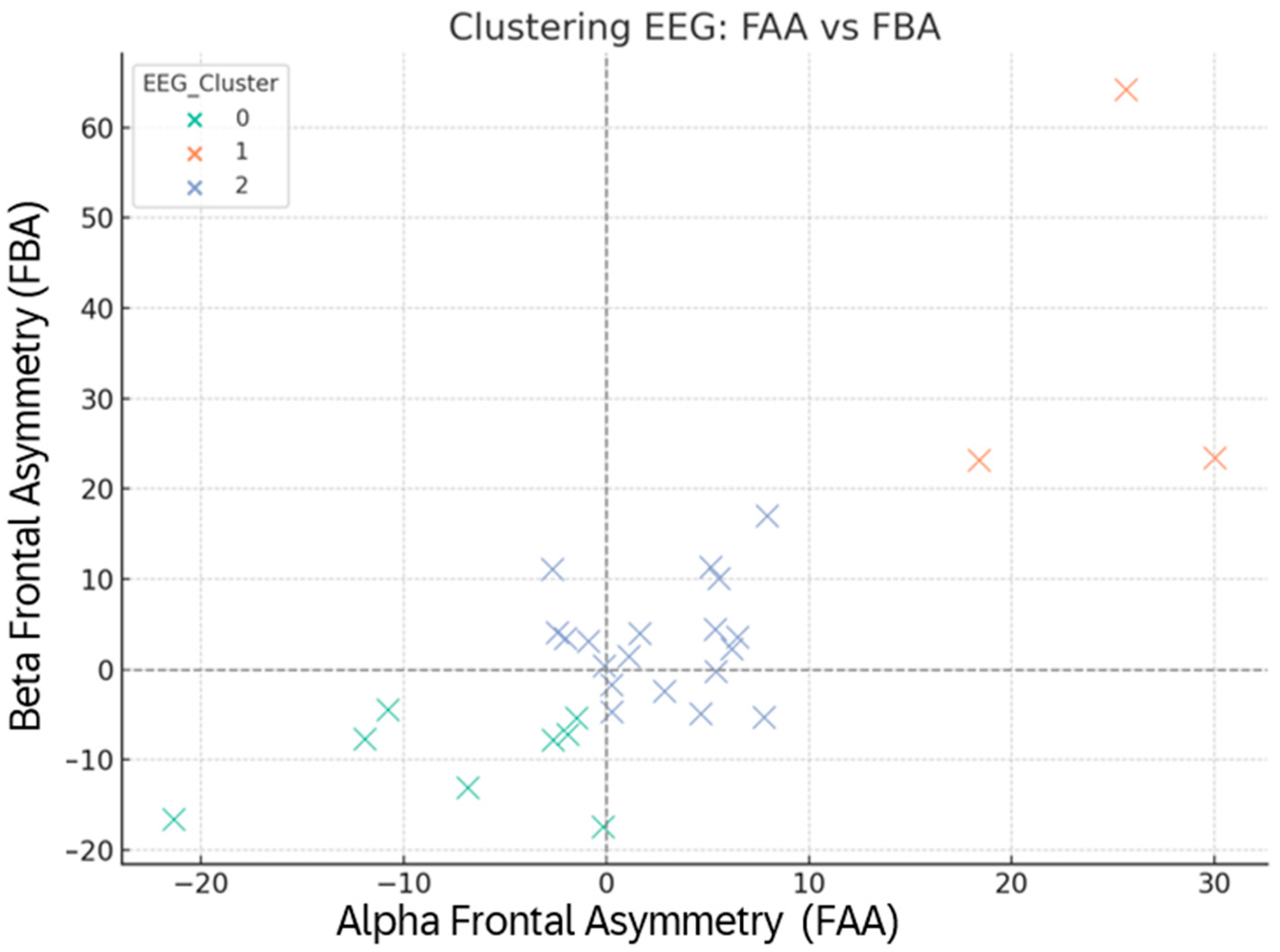 Two-dimensional representation of EEG clustering based on frontal Alpha (FAA) and Beta (FBA) asymmetry during the viewing of emotional images (Set 2). Each point represents a participant, color-coded according to EEG cluster membership (0—green, 1—orange, 2—blue). The axes indicate the mean FAA and FBA values, expressed in microvolts (μV). The dotted lines mark the zero reference thresholds, delineating the balance point between left and right hemispheric activation.