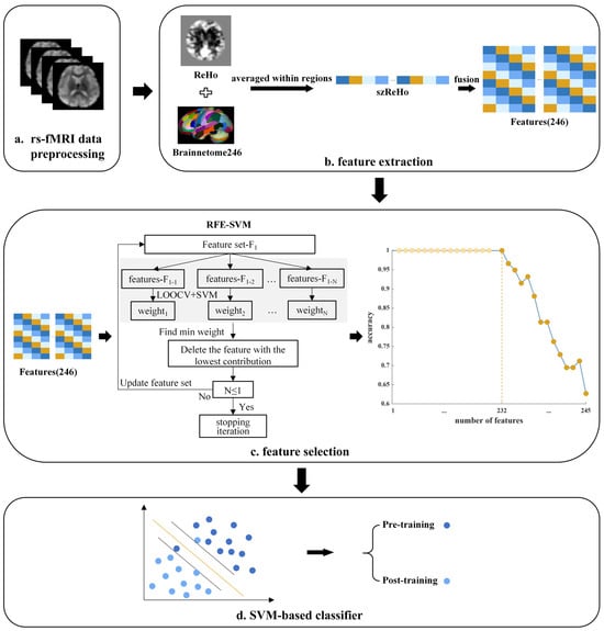 Data analysis pipeline. (a) Resting-state fMRI (rs-fMRI) data were preprocessed. (b) Feature extraction: voxel-wise ReHo maps were standardized (szReHo) and averaged within 246 ROIs defined by the Brainnetome atlas, yielding 246 regional ReHo features. (c) Feature selection: a recursive feature elimination–support vector machine (RFE–SVM) approach iteratively removed the least informative features until optimal classification accuracy was reached. The curve shows classification accuracy across feature subsets; the dark orange point marks the final retained feature set. (d) Classification: the retained features were used in a linear SVM classifier to distinguish resting-state brain patterns before and after radiological training.