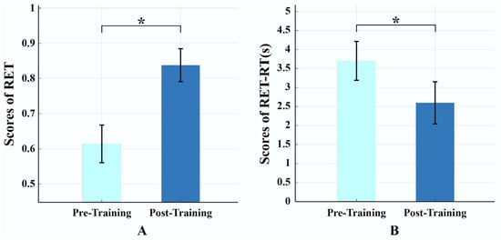 Results of behavioral tests pre- and post-training. (A) Significant increase in radiological expertise test (RET) scores, indicating enhanced diagnostic accuracy. (B) Significant reduction in response time during RET, reflecting faster decision-making. Note: * indicates the significant differences p < 0.05; light blue denotes pre-training, and dark blue denotes post-training.