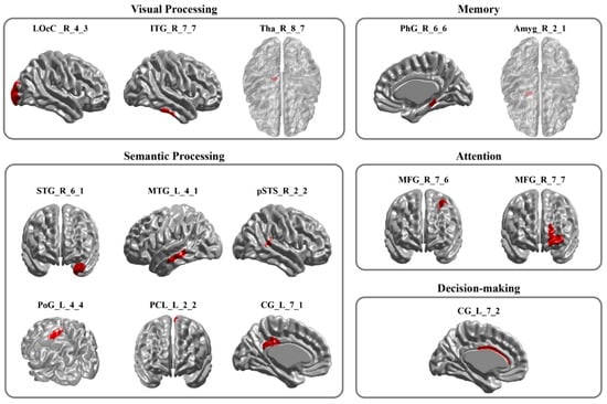 The Retained Brain Regions. This figure highlights the brain regions that contribute to classification in distinguishing pre- and post-radiological training resting-state brain activity. Brain regions identified by Regional Homogeneity (ReHo)–based feature selection and Recursive Feature Elimination–Support Vector Machine (RFE-SVM) that discriminated pre- from post-training resting-state activity. Regions are grouped by associated cognitive domains: visual processing, memory, semantic processing, attention, and decision-making. Abbreviations: LOcC, lateral occipital cortex; ITG, inferior temporal gyrus; Tha, thalamus; PhG, parahippocampal gyrus; Amyg, amygdala; STG, superior temporal gyrus; MTG, middle temporal gyrus; pSTS, posterior superior temporal sulcus; PoG, postcentral gyrus; PCL, paracentral lobule; CG, cingulate gyrus; MFG, middle frontal gyrus.