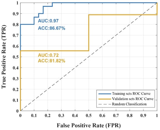 To determine if the retained features can reliably differentiate between resting-state brain patterns before and after radiological training, we applied these features to train an SVM model. The SVM classifier achieved an accuracy of 86.67% on the training dataset, with specificity and sensitivity values of 86.67% and 66.67%, respectively. In the validation dataset, the classifier attained an accuracy of 81.82%, with specificity and sensitivity values of 50% and 88.89%, respectively. As shown in Figure 4, the AUC values for the training and validation datasets were 0.97 and 0.72, respectively. Additionally, a permutation test (1000 iterations) was conducted to confirm that classification accuracy exceeded chance level (p < 0.01), further supporting model robustness. These results demonstrate that the retained features, representing distinct brain regions, had high discriminative power, effectively distinguishing between pre- and post-training resting-state brain patterns.