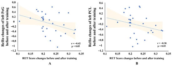 Scatterplots Showing Correlations Between ReHo Changes and RET Scores for two brain regions. (A) Correlation between Radiological Expertise Test (RET) score changes and Regional Homogeneity (ReHo) changes in the left postcentral gyrus (PoG). (B) Correlation between RET score changes and ReHo changes in the left paracentral lobule (PCL). Each scatterplot shows the linear trend line with 95% confidence intervals (shaded areas). Spearman correlation coefficients (r) and significance levels (p < 0.05, FDR-corrected) are displayed in the lower right corner.