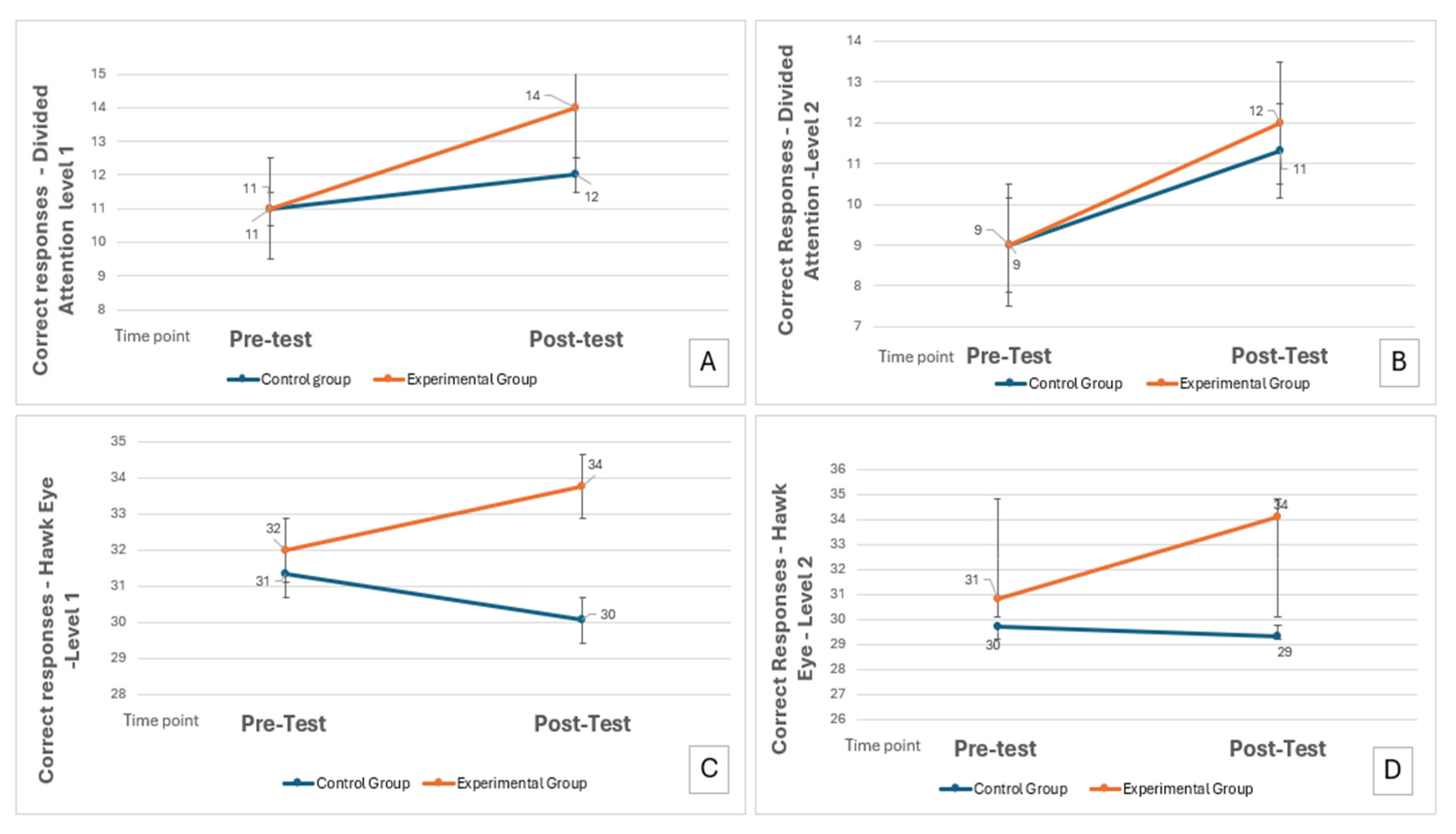 | Hawk Eye Level 2 | Control Group | 29.7 | 2.9 | 29.3 | 2.4 | 1.11 | F (1162) = 28,554, p < 0.001 (pFDR = 0.002) |